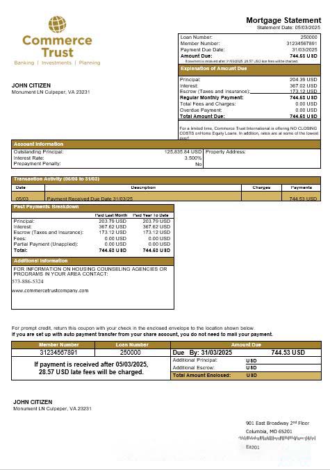 USA Commerce Trust Bank mortgage statement in Word and PDF formats download template file