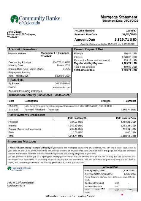 USA Community Banks of Colorado bank mortgage statement in Word and PDF formats download template file