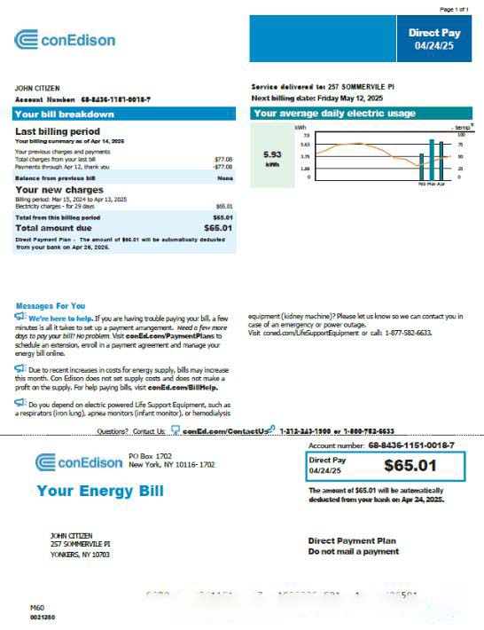 USA Conedison utility bill template in Word and PDF formats, version 2 download template file