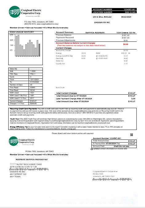 USA Craighead Electric business utility bill template in Word and PDF formats download template file