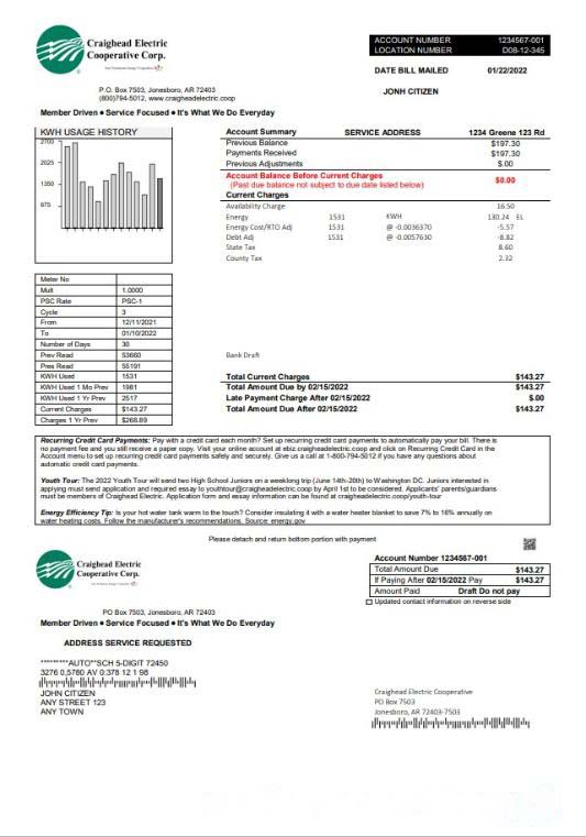 USA Craighead Electric utility bill template in Word and PDF format download template file