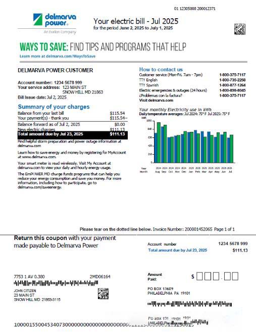 USA Delmarva Power utility bill template in Word and PDF formats, version 3 download template file