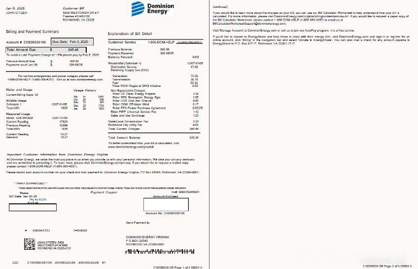 USA Dominion Energy utility bill template in Word and PDF formats, 3 pages, 1 2 pages download template file