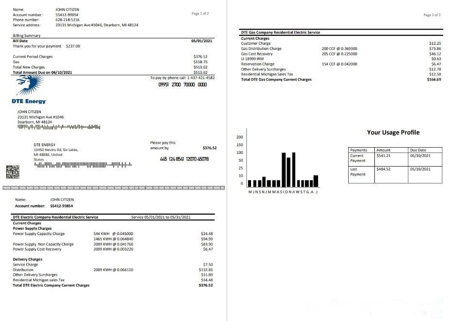 USA DTE Energy utility bill template in Word and PDF format (2 pages) download template file