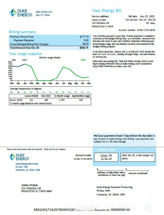 USA Duke Energy utility bill template in Word and PDF formats, version 6 download template file