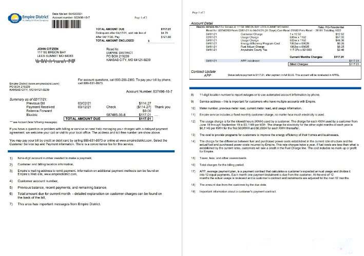USA Empire District Electric Company utility bill template in Word and PDF format (2 pages) download template file