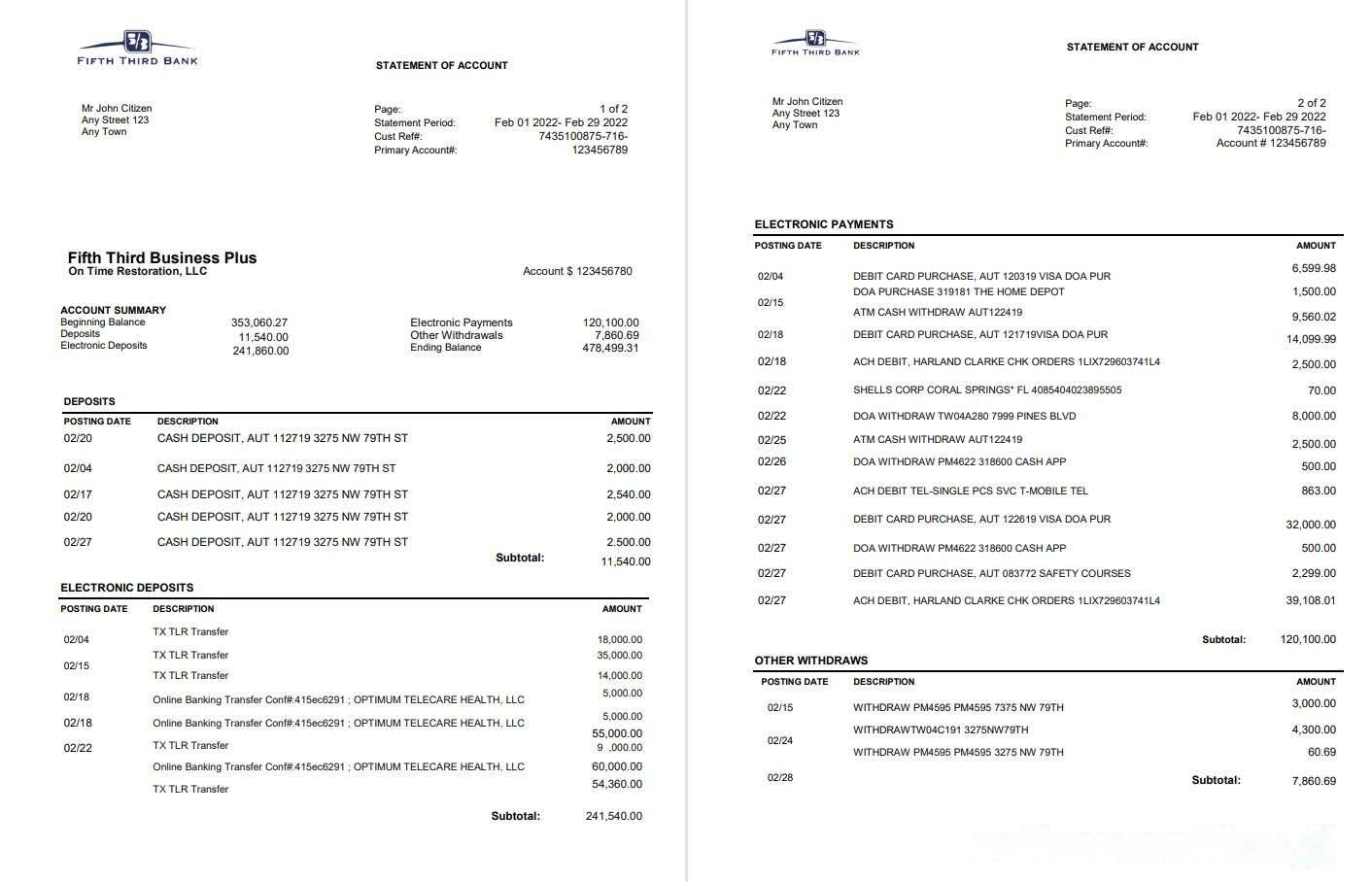 USA Fifth Third Bank statement, Word and PDF template, 2 pages download template file