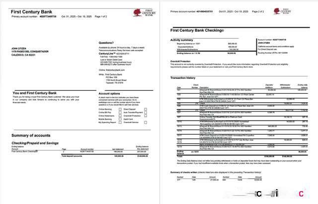 USA First Century Bank account statement Word and PDF template, 2 pages download template file