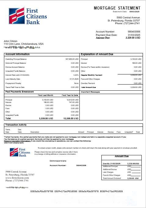 USA First Citizens bank mortgage statement in Word and PDF formats download template file
