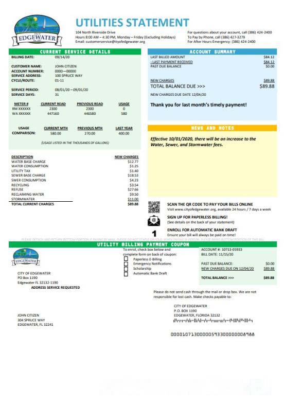 USA Florida City of Edgewater utility bill template in Word and PDF format download template file