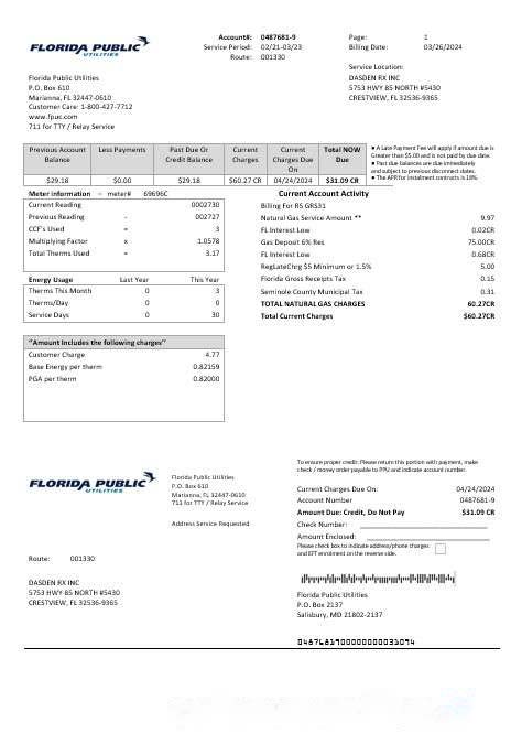 USA Florida Public Utilities business utility bill template in Word and PDF formats download template file
