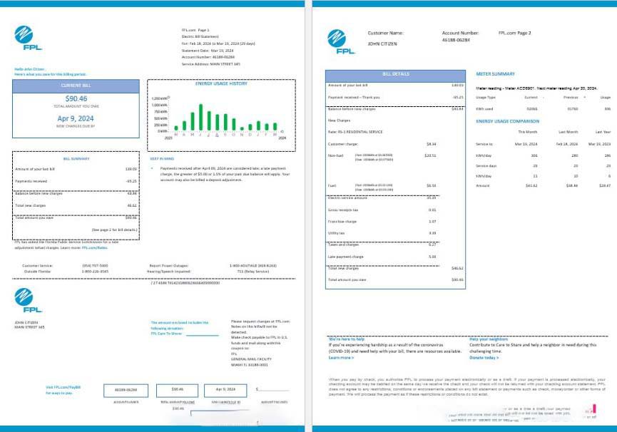 USA FPL electricity utility bil Word and PDF formats, 2 pages, version 2 download template file