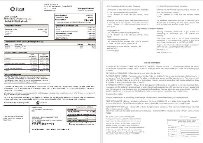 USA Frost bank mortgage statement in Word and PDF formats download template file