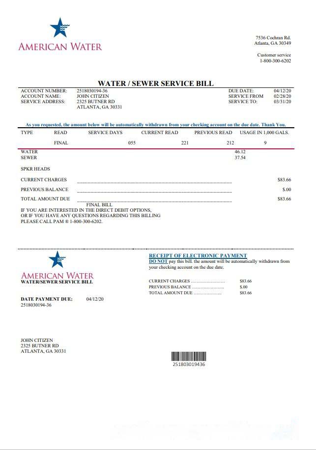 USA Georgia American Water utility bill template in Word and PDF format download template file