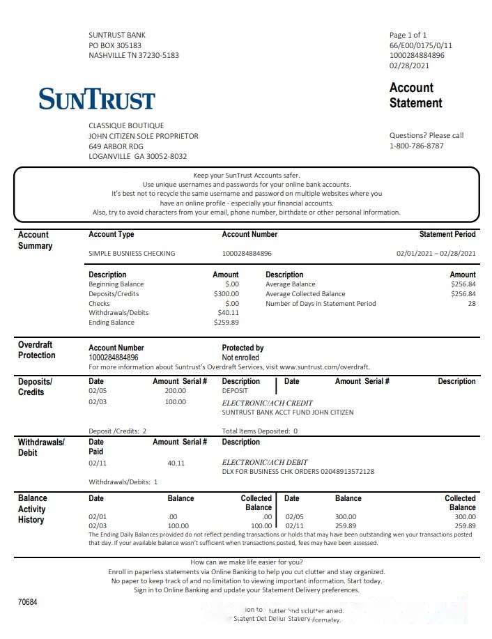 USA Georgia SunTrust bank statement template in Word and PDF format (For Sole Proprietor) download template file