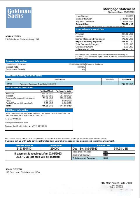 USA Goldman Sachs bank mortgage statement in Word and PDF formats download template file