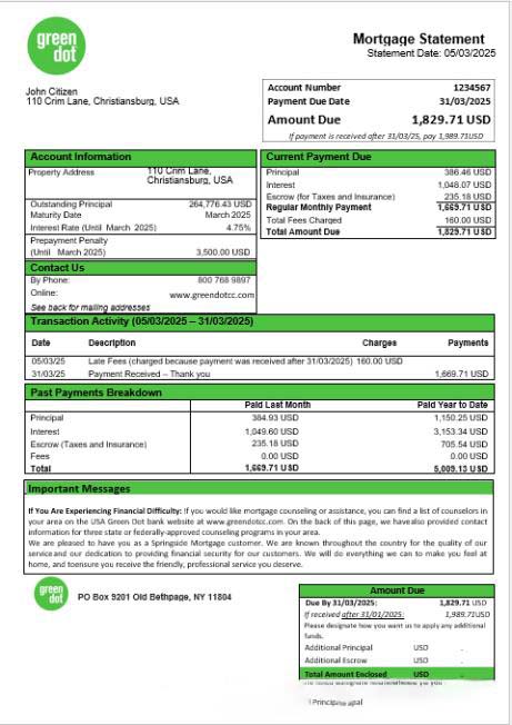 USA Green Dot mortgage statement in Word and PDF formats download template file