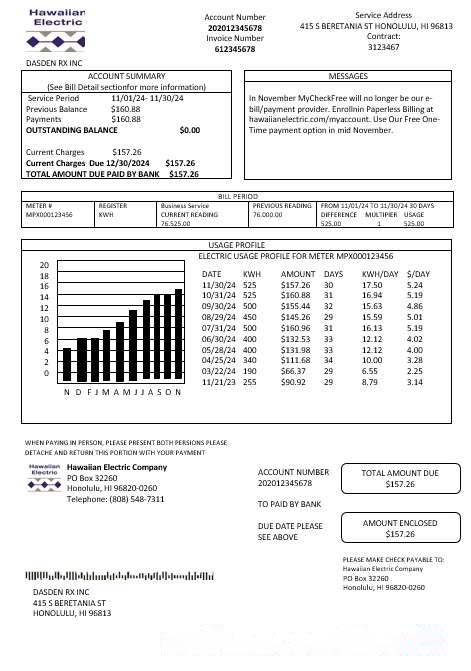 USA Hawaiian Electric business utility bill template in Word and PDF formats download template file