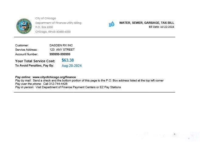 USA Illinois Chicago water, sewer, garbage, tax business utility bill Word and PDF template download template file