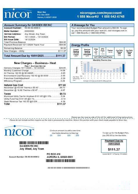 USA Illinois Nicor gas business utility bill template in Word and PDF formats download template file