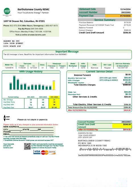 USA Indiana Bartholomew County REMC business utility bill template in Word and PDF formats download template file