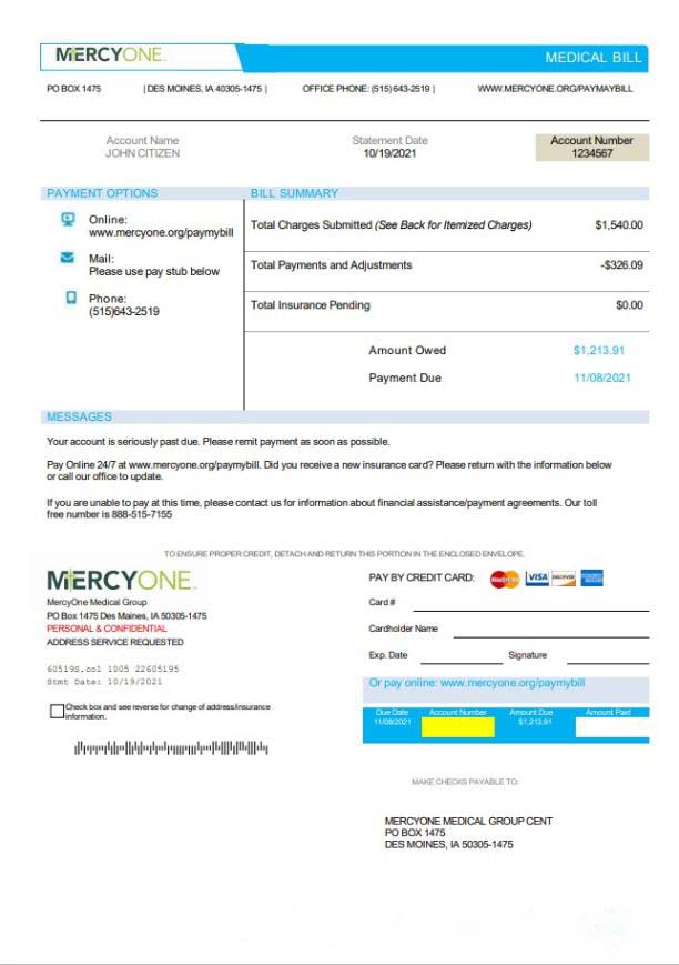 USA Iowa MercyOne medical bill template in Word and PDF format download template file