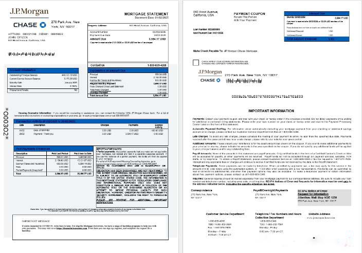 USA JP Morgan Chase bank mortgage statement in Word and PDF formats 1 2 download template file