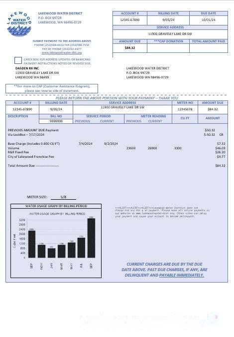 USA Lakewood Water District business utility bill template in Word and PDF formats download template file