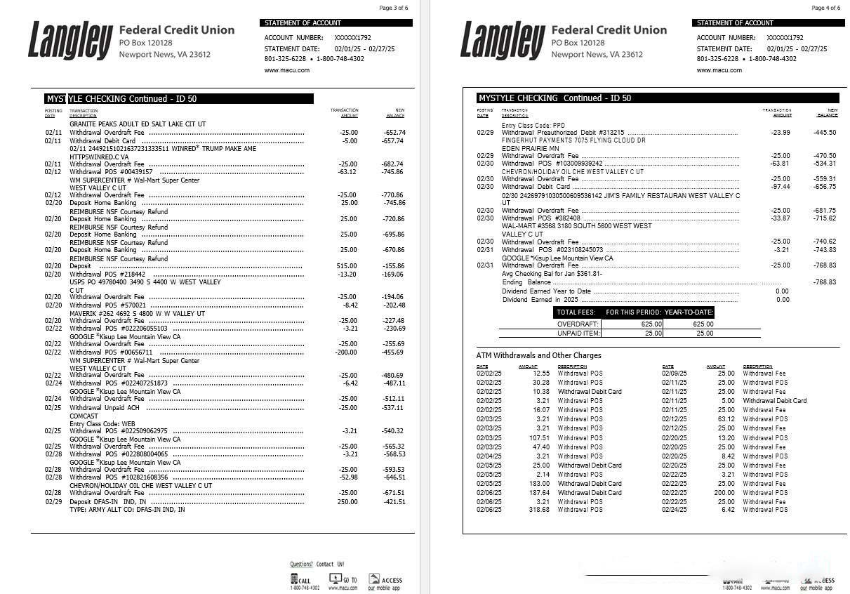 USA Langley Federal Credit Union bank statement, 6 pages 2 download template file