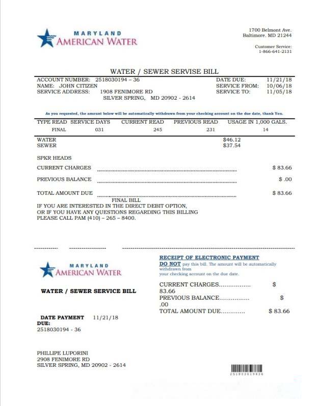 USA Maryland American water utility bill template in Word and PDF format download template file