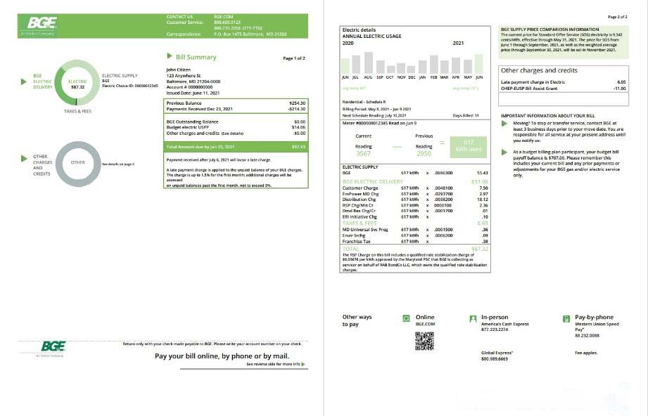 USA Maryland Baltimore Gas and Electric (BGE) utility bill template in Word and PDF format (2 pages) download template file