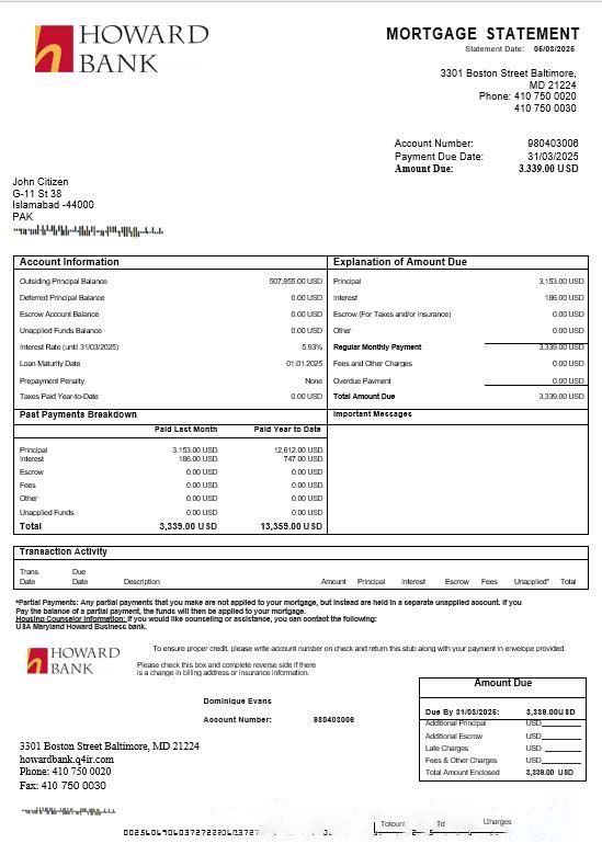 USA Maryland Howard Business bank mortgage statement in Word and PDF formats download template file