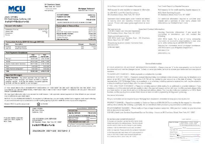 USA MCU bank mortgage statement in Word and PDF formats download template file