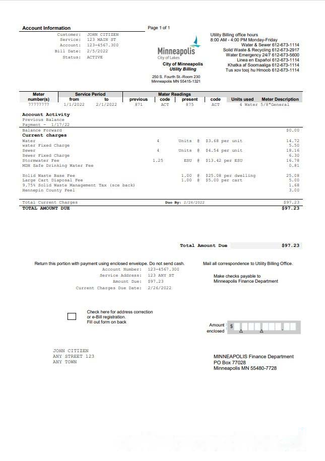 USA Minnesota Minneapolis City of Lakes utility bill template in Word and PDF format download template file