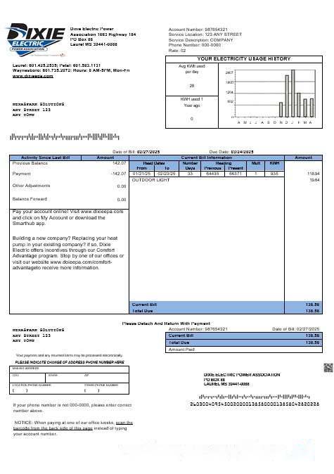 USA Mississippi Dixie Electric business utility bill template in Word and PDF formats download template file