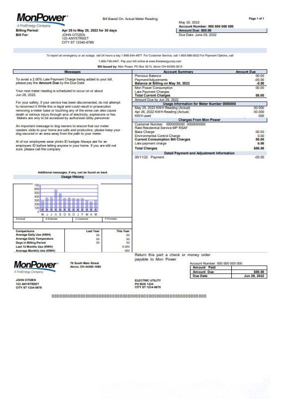 USA Mon Power utility bill template in Word and PDF format download template file