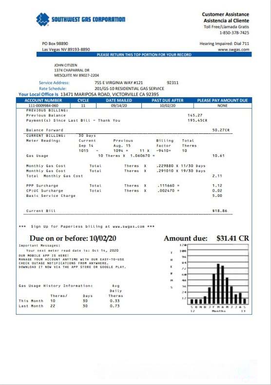 USA Nevada Southwest gas Corporation utility bill template in Word and PDF format download template file