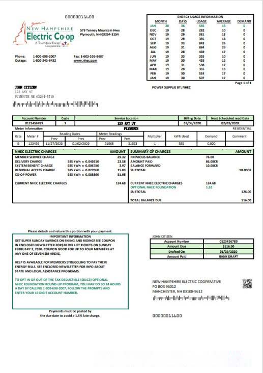 USA New Hampshire Electric Co op electricity utility bill template in Word and PDF format download template file