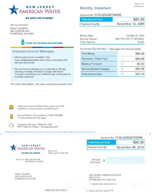 USA NEW JERSEY AMERICAN WATER utility bill Word and PDF template download template file