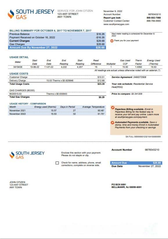 USA New Jersey South Jersey Gas utility bill template in Word and PDF format download template file