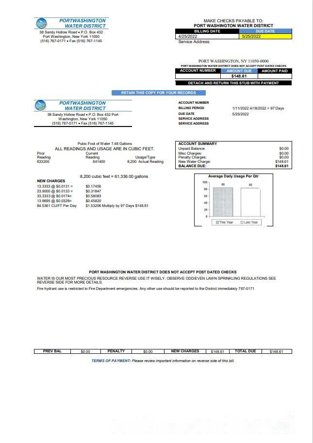 USA New York Port Washington Water District utility bill template in Word and PDF format download template file