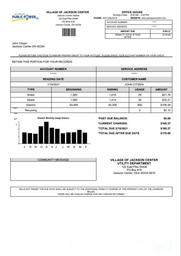 USA Ohio Village of Jackson Center Public Power utility bill template in Word and PDF format download template file