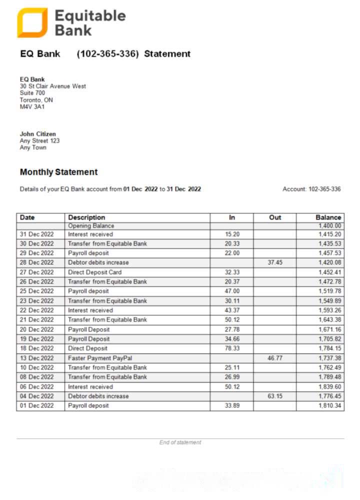 USA Ontario Equitable Bank statement Word and PDF template download template file