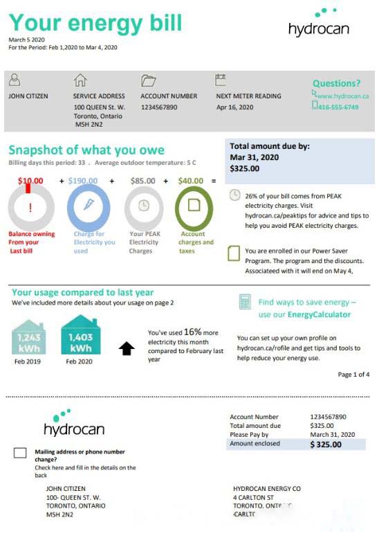 USA Ontario Hydrocan electricity utility bill template in Word and PDF format download template file