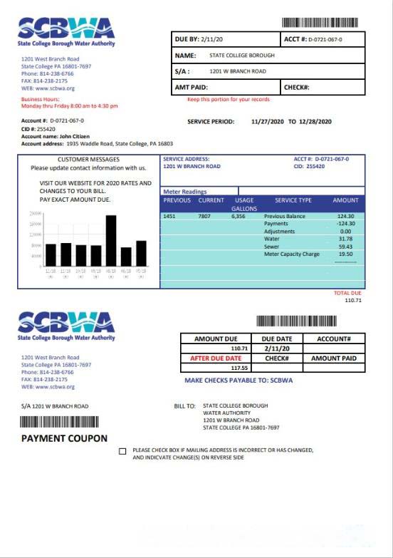 USA Pennsylvania SCBWA water utility bill template in Word and PDF format download template file