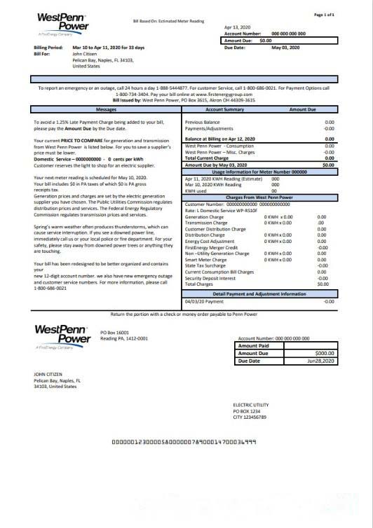 USA Pennsylvania West Penn Power utility bill template in Word and PDF format download template file
