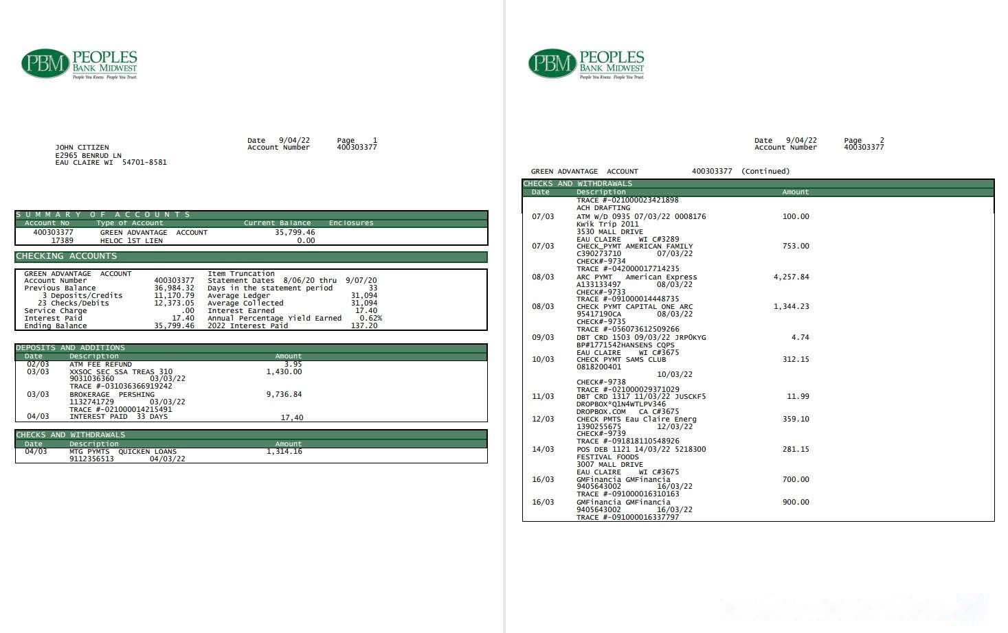 USA Peoples Bank Midwest (PBM) bank statement 5 pages download template file