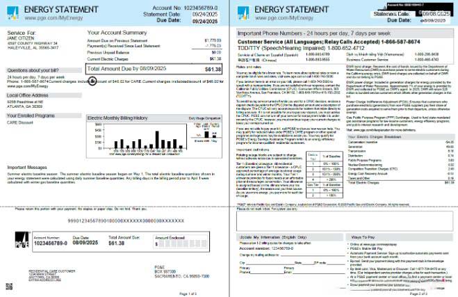 USA PG&E utility bill template in Word and PDF formats, 3 pages, 1 2 pages download template file