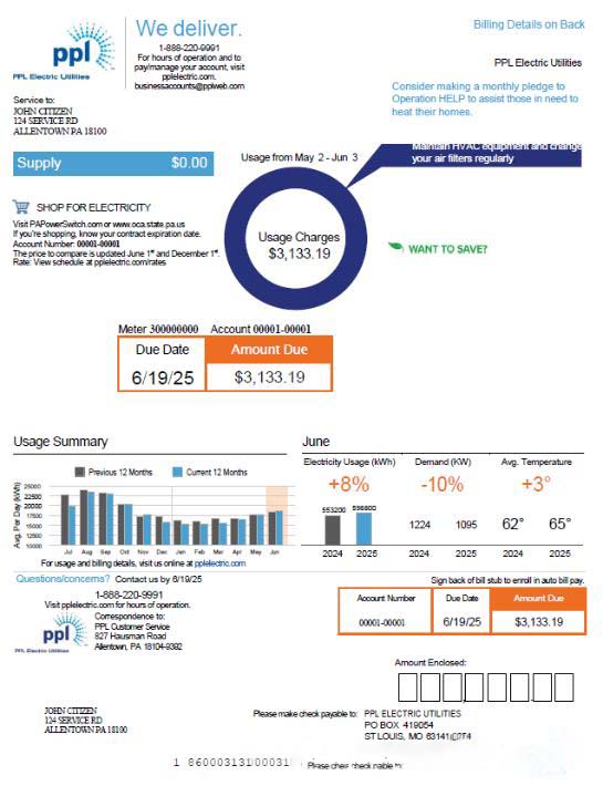 USA PPL Electric utility bill template in Word and PDF formats, version 2 download template file
