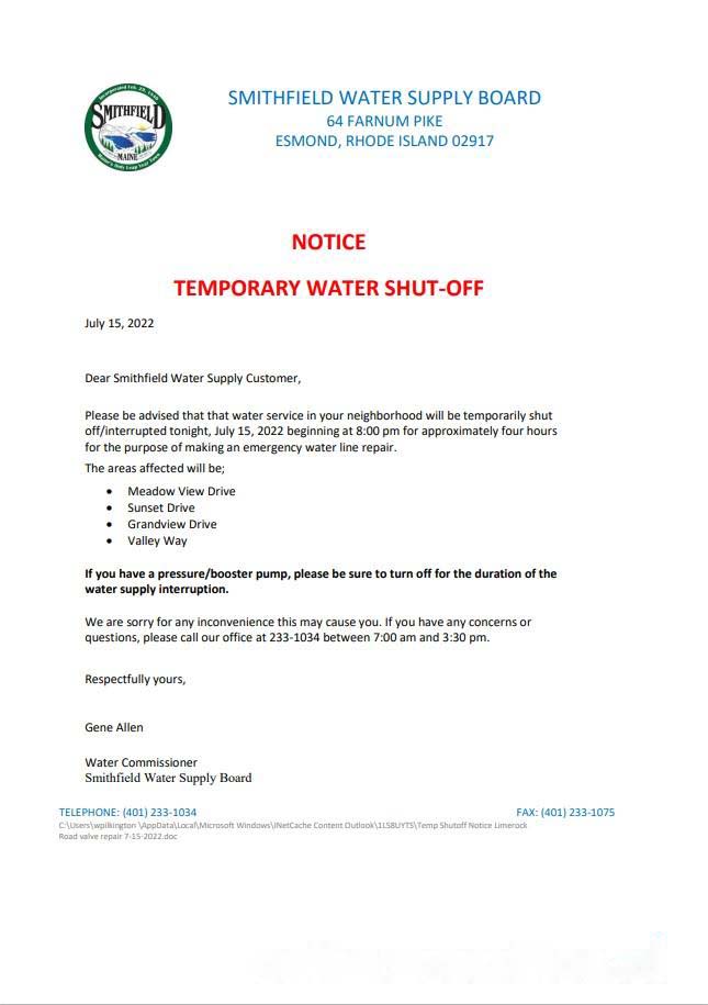USA Rhode Island Smithfield water supply board water shut off notice, Word and PDF template download template file